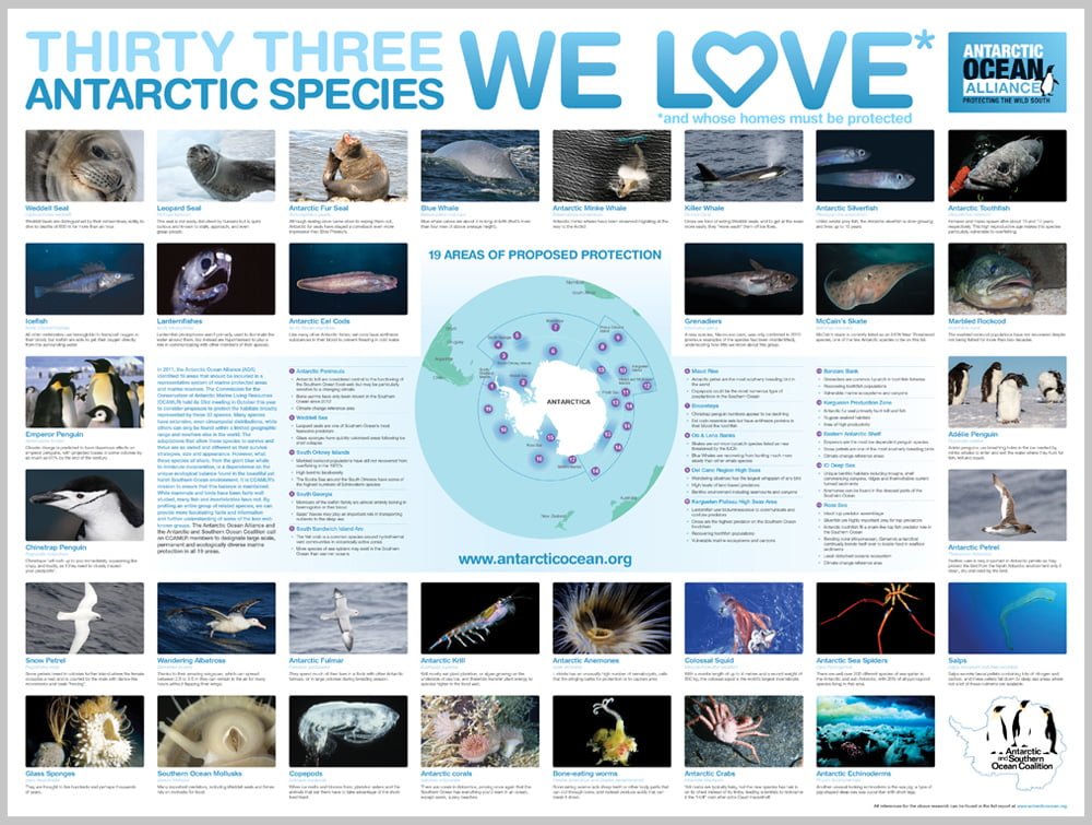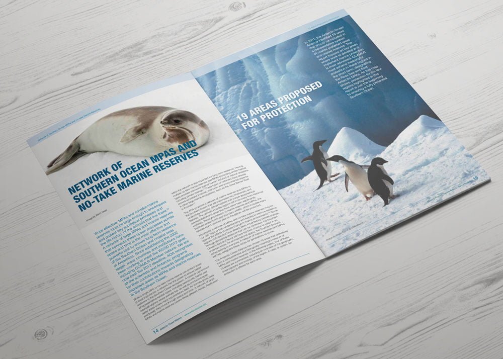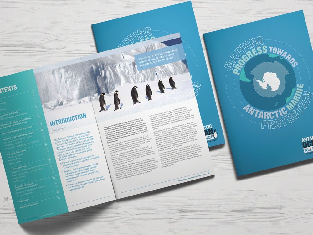 The Antarctic Ocean Alliance (AOA) is a coalition of leading environmental and conservation organisations working to establish a network of designated, no-take marine reserves and marine protected areas in the Antarctic. This year we worked with AOA on materials for the CCAMLR meeting including a 40 page report, invitations and even ‘penguin police’ branding.