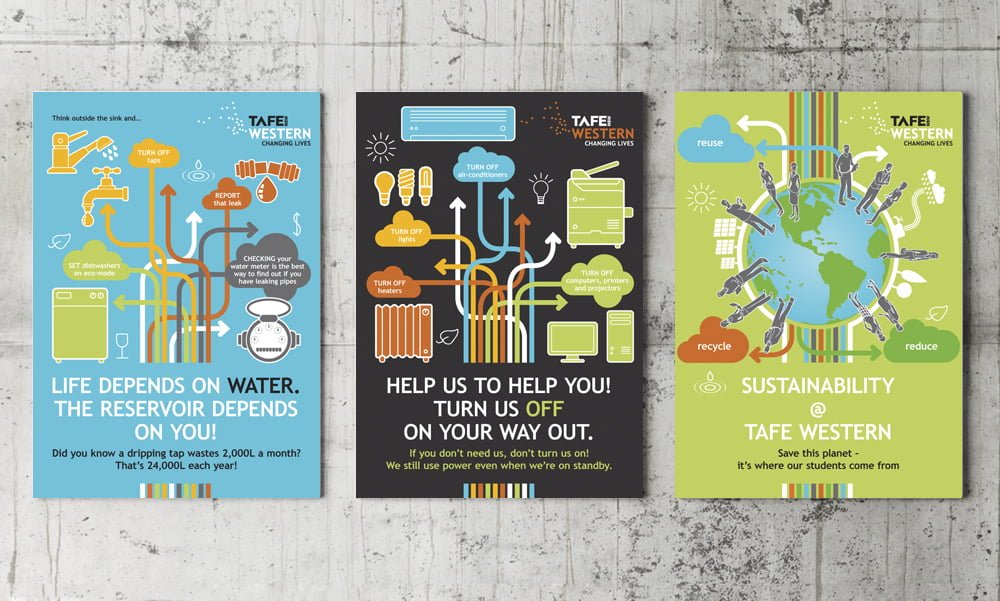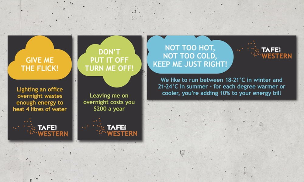 Our friends at TAFE Western NSW, needed an eye catching campaign that would encourage students and staff to engage in energy conservation on campus. We delivered a vibrant design which focused on communicating a positive and empowering message about the environmental and financial benefits of conserving energy.